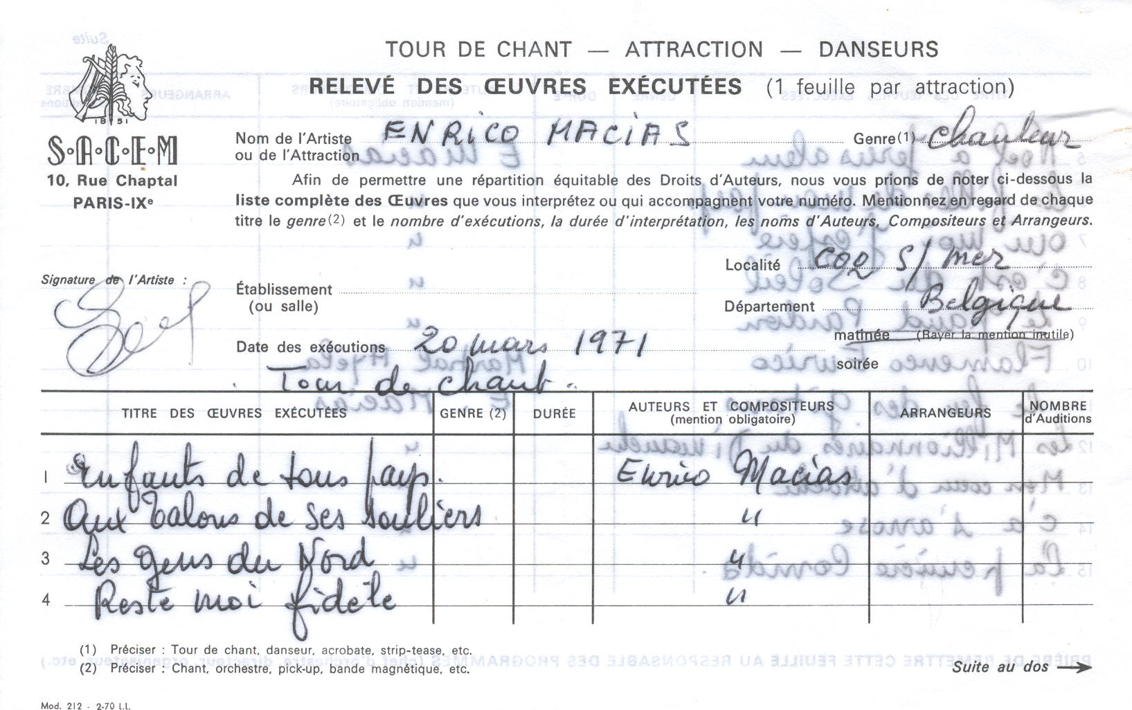J'ai même la liste des chansons interprétées pendant le tour de chant, liste établie par Enrico Macias lui-même! Si ce n'est pas un objet de collection qui vaudra beaucoup d'argent quand il sera mort! De nombreuses chansons de l'époque me reviennent à l'esprit: Enfants de tous pays, J'appelle le soleil, Mon cœur d'attache, les millionaires du dimanche,…